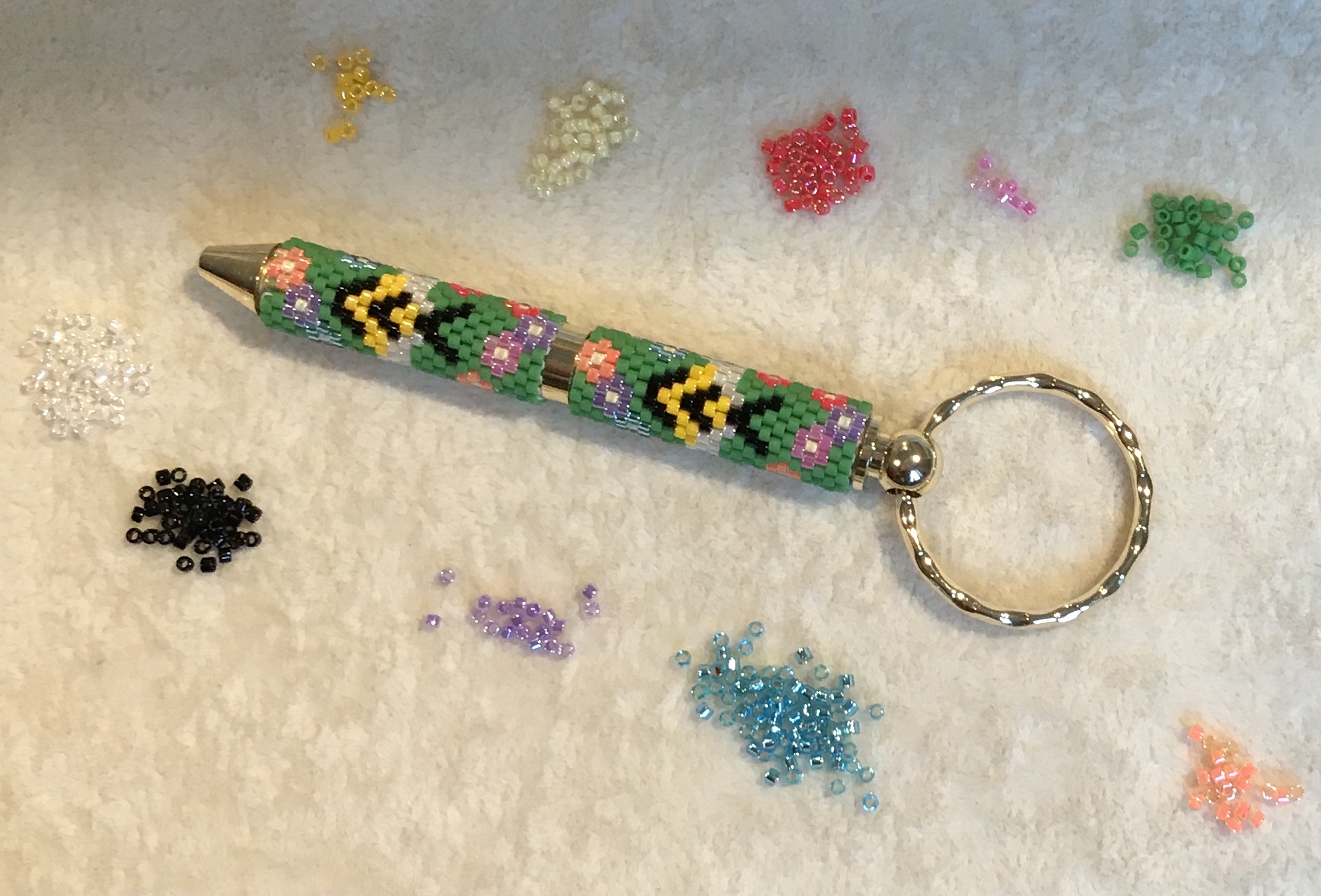 1,440 beads are individually threaded to form a pattern of Bees and flowers which is then wrapped on to the pen. Just the right size to pop into your Handbag or give to a loved one. The pen is a high quality item and the refill is D1.